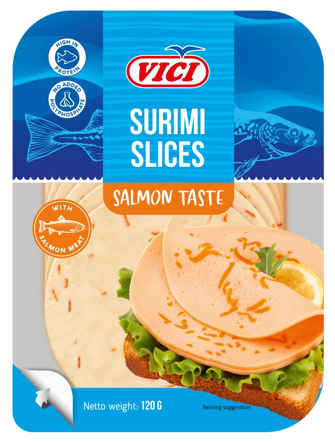 Be the first to review “VICI Surimi sausage slices with salmon taste 42%, 120g”